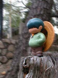 | 木の切り株の上で。あとからフォトショップで背景をぼかしてみました(大失敗…)。 | |