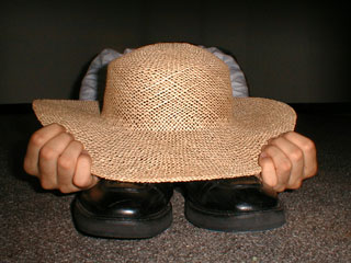 ▲買って来た麦わら帽を見つめつつ考え込むサラリーマン