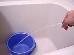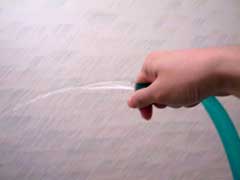 実験方法はこうだ。まずホースを蛇口につないで水を出す。劇中のシーンから、ジミーの放尿は水平距離にして約5メートル飛んで垂直落下に至っていると考えられるから、ホースの先端をつまんだり水量を調整したりして、同じような放出量を再現するんだ。もっとも、今回の実験を担当するサラリーマンの家庭には残念ながら5メートルも水を飛ばせる風呂場がないので、1メートルで実験したものに5をかけて算出することにするよ。 |
