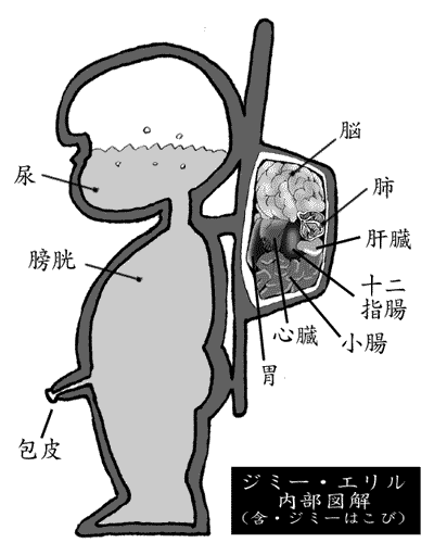 我々がジミー・エリルだと思っている物体は、実は移動用キャリアー兼尿タンク、通称「ジミーはこび」なんだよ。ジミー本体は、ジミーはこびに寄生する形で生存しているんだ。 |