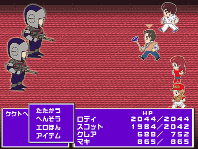 ■キャラクター紹介 13人の中で最年長の15歳。一行のキャプテンでもある。その挙動不審ゆえ敵に目をつけられやすいという欠点を持つが、ツボにはまった時の攻撃力は絶大である。片時も吸盤棒を手放そうとせず、これ1本でトイレ清掃・敵との戦闘・筋トレ・千本ノック・歯の隙間そうじ・楽団の指揮など何でもこなしてしまう。特殊コマンド「エロほん」は強力だが、クレアに見つかると彼女の特殊コマンド「おおたちまわり」を誘発する場合があるので注意。 ■スコットの特殊コマンド