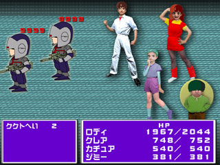 ■キャラクター紹介 7歳。普段は無口で目立たずHPも低いが、近距離攻撃・遠距離攻撃いずれにおいても高い効果を誇る数々の技を会得している。またククト山羊の大群を召喚して敵に突進させるといった召喚魔法にも優れており、ここ一番という時に役に立つキャラクターである。ちなみに動きは全体的にスローであるが、白魔法「スロウ」がかかっているわけではない。 ■ジミーの特殊コマンド