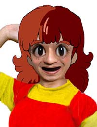 CHAPTER 8 〜かおの かこう(あしだキャラらしく する) あらかじめ かいておいた まゆげを がったいだ! おんなのこ らしく まつげも のばして ほっぺも こころもち ピンクに しよう! めのしたの ちょんちょんが いかにも あしだキャラって かんじだね! | |