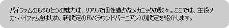 | 作業用のラウンドバーニアン。軍から払い下げられた機体をベルウィック星の資源調査局が運搬用として使用していたため、レーダーセンサーや一部の装甲板が取り外されている。バイファムとは同系列の機体で、バイファム用のスナイパーライフルも使用可能。定員1名。劇中では第4話でバーツ、第5話でティアラとケンツが搭乗した。 |